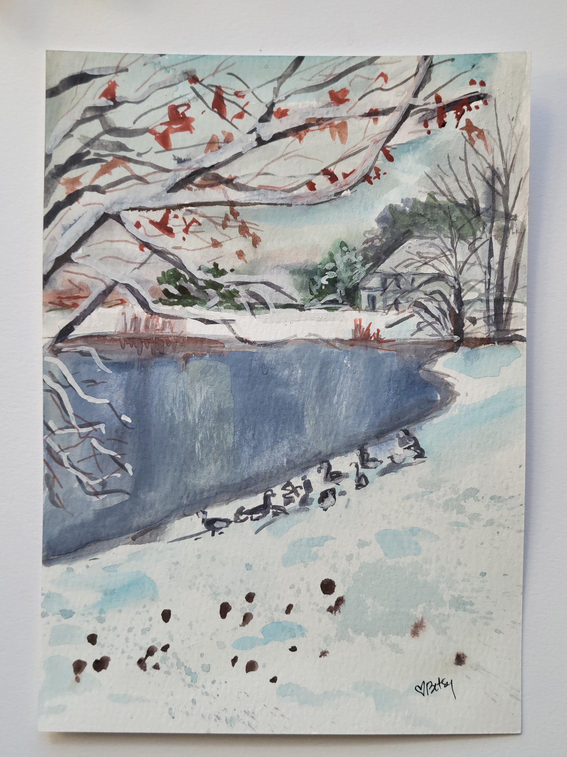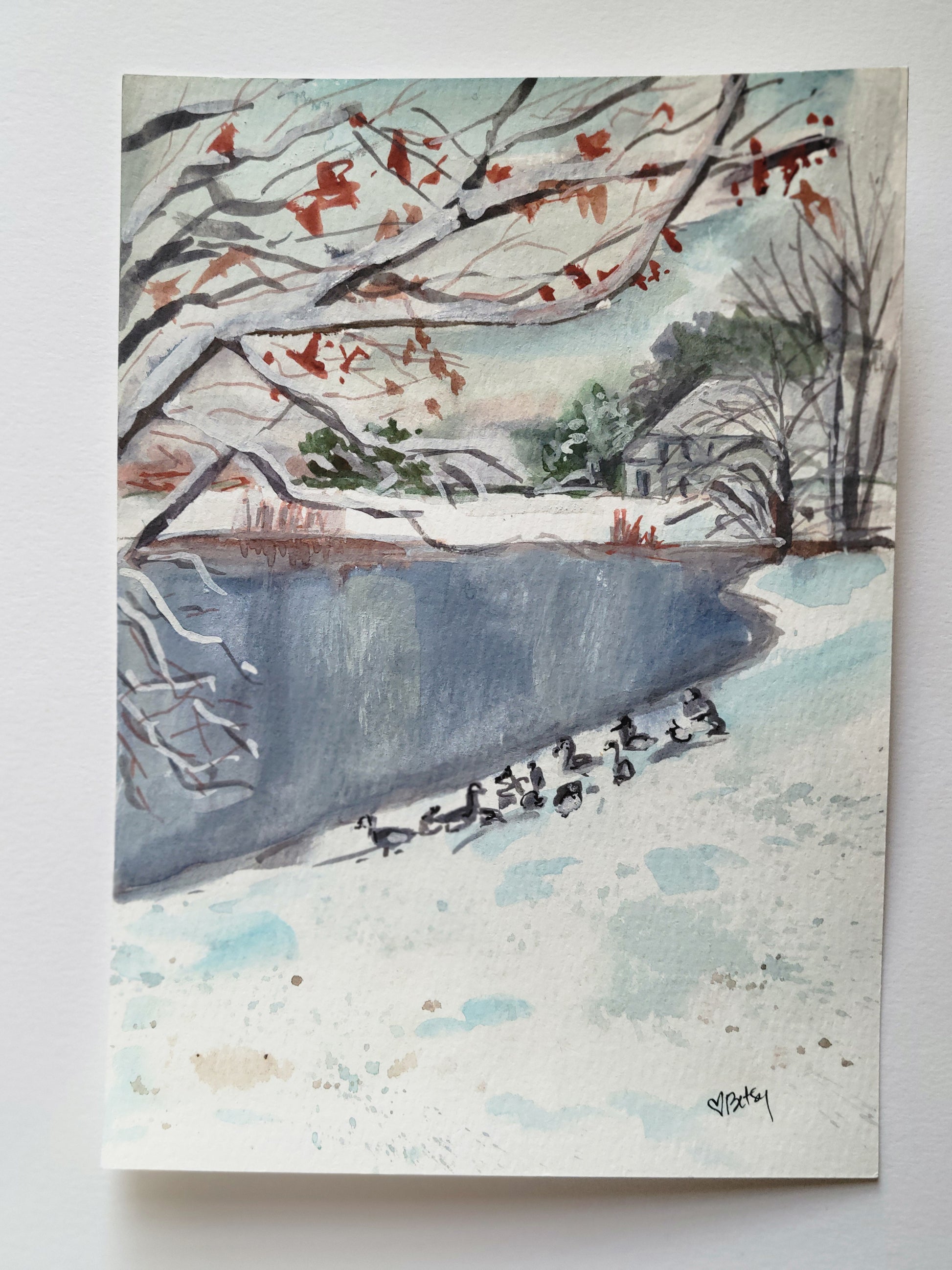 5"x7" Original gouache painting on 140 lb. cotton watercolor paper by Betsy Gaccione. My neighborhood sees gaggles of geese congregate around our ponds during their winter migration because our temps are usually mild, and this rare TN snowfall probably caught them off guard, but their graceful presence added to the magic of this day. Cool blacks and blues are contrasted with a touch of warm rust from leaves and brush to create a serene and cozy palette. Art piece will come matted to fit a standard 8x10 photo frame.
