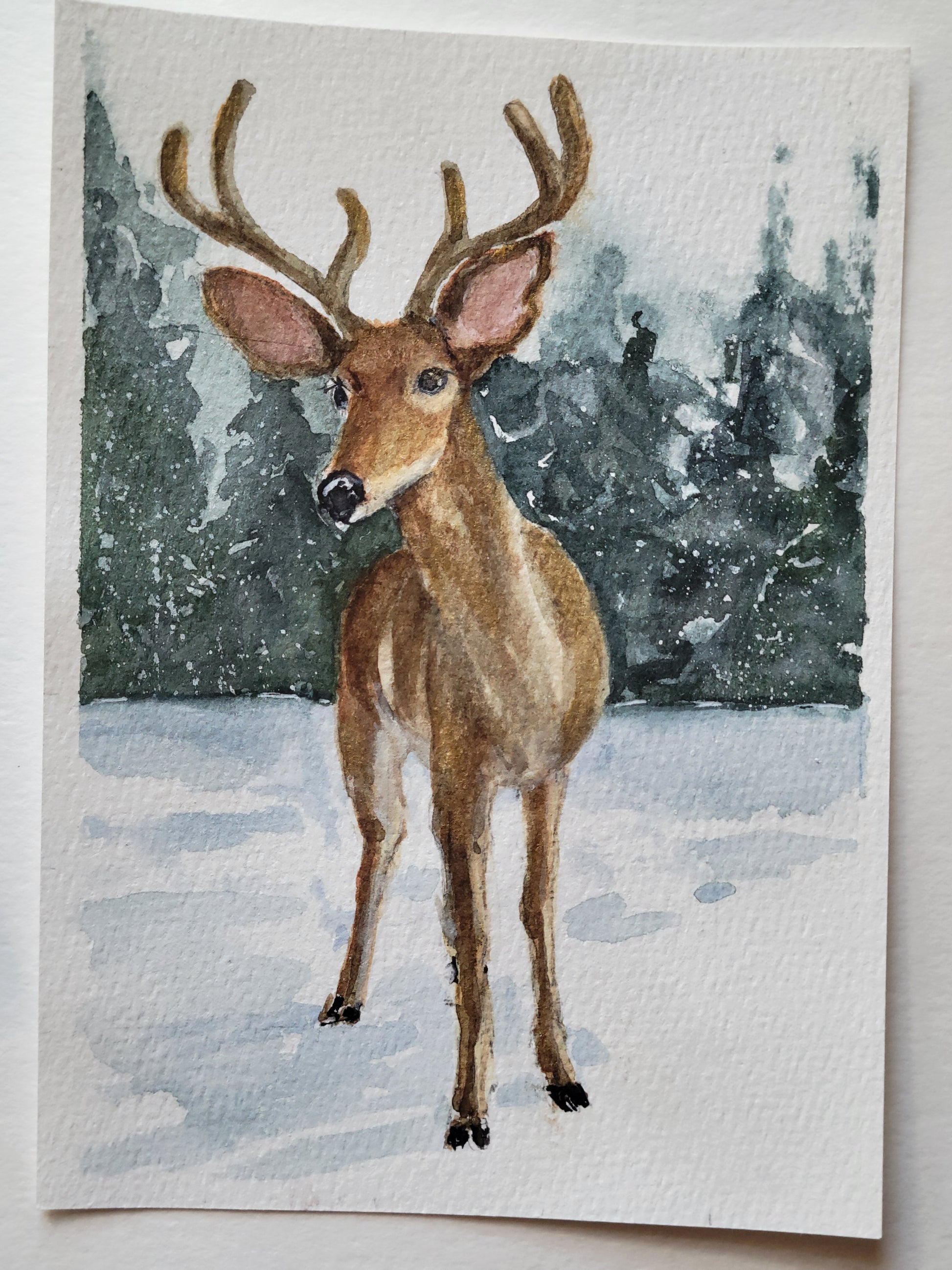 5"x7" Original watercolor painting on 140 lb. cotton watercolor paper by Betsy Gaccione. Deer symbolize purity, gentleness, and grace. When we encounter one, we often slow down and approach with a softer more graceful presence. We observe, admire, and then quietly pass in kindness and peace. May he be a reminder to approach the holiday season with same pure and gentle grace. Art piece will come matted to fit a standard 8x10 photo frame.