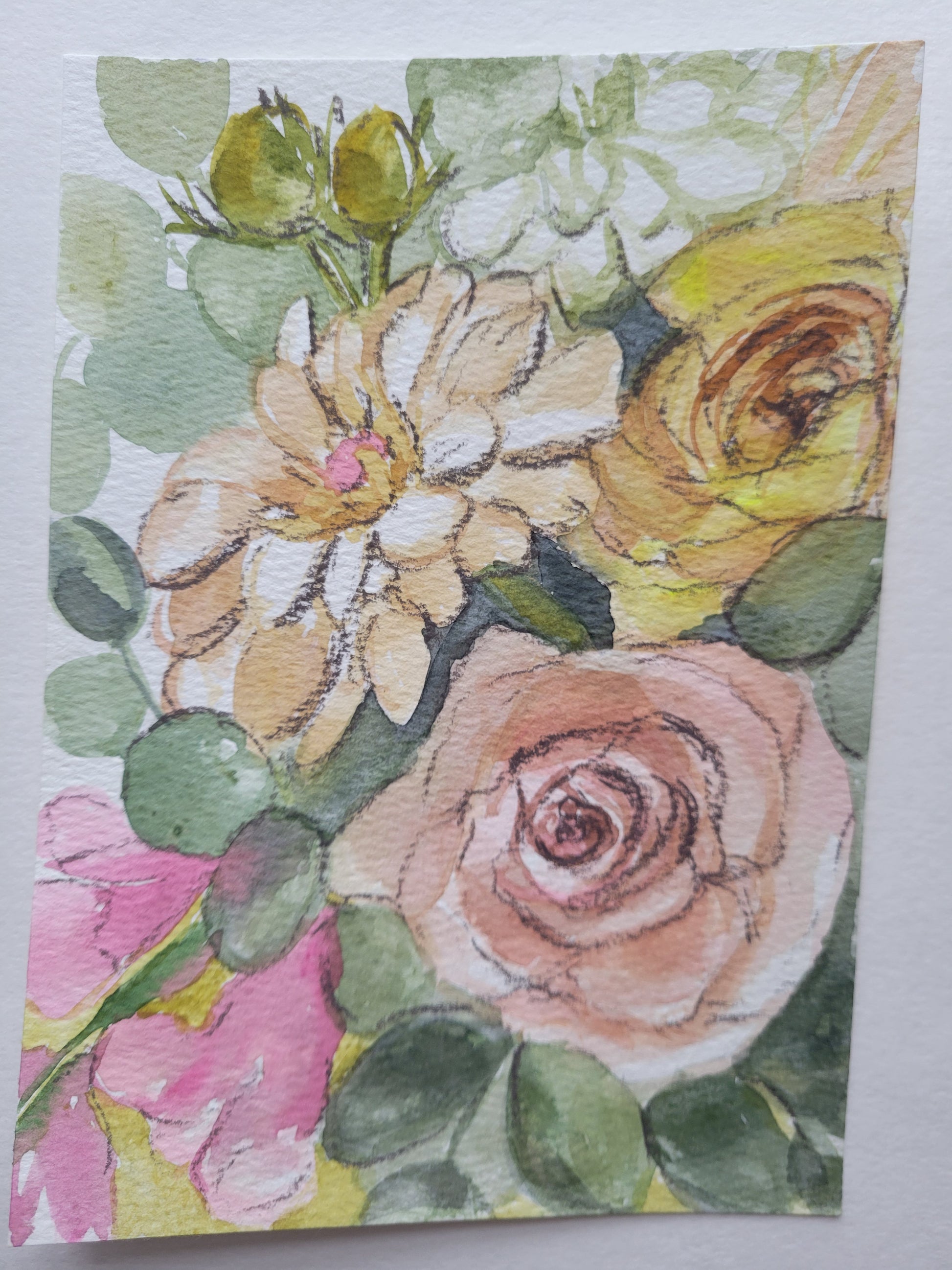 5"x7" Original watercolor and pencil painting on 140 lb. cotton watercolor paper by Betsy Gaccione. Zinnias, roses, and more. Art piece will come matted to fit a standard 8x10 photo frame.