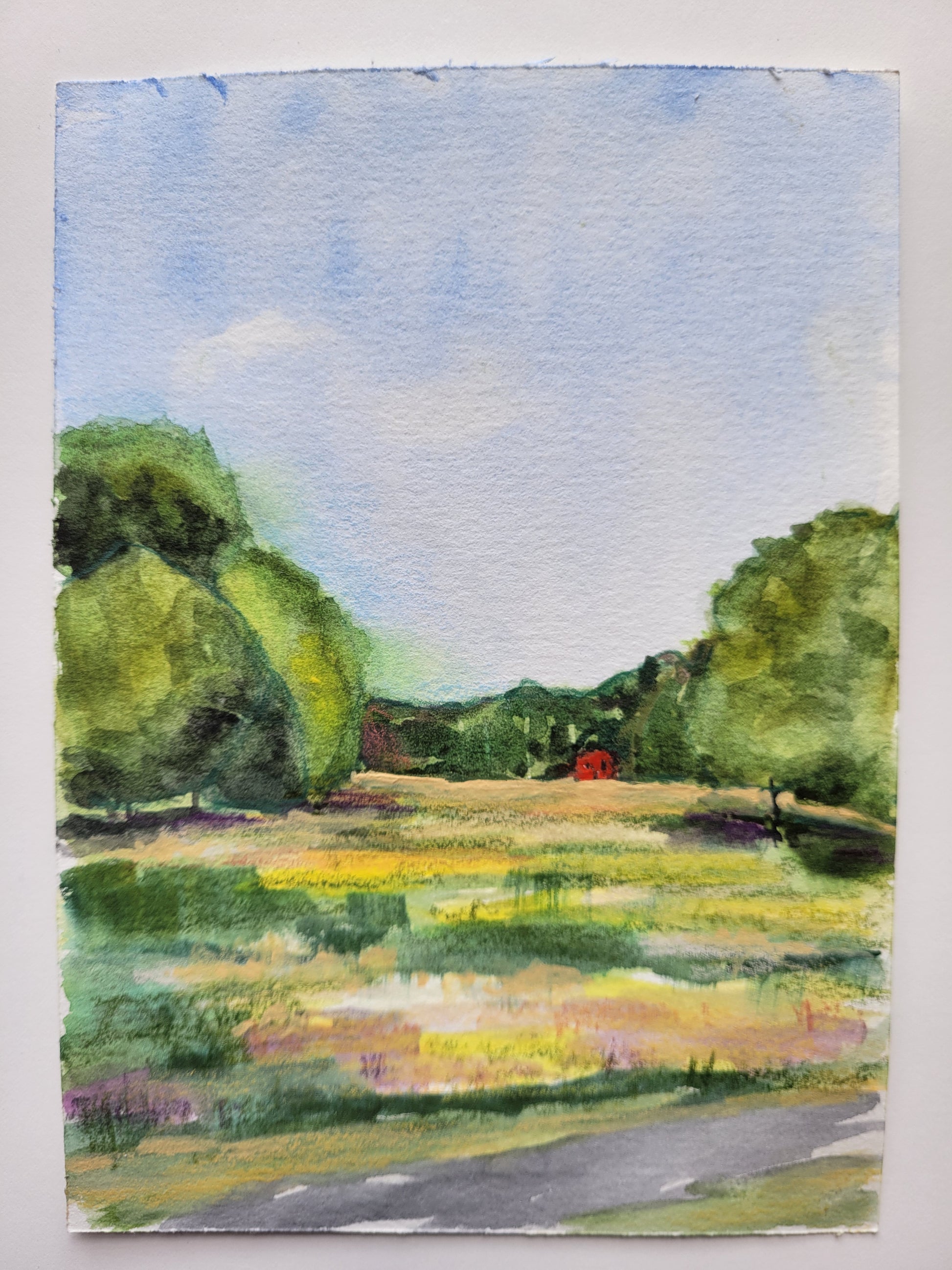 5"x7" Original watercolor and wax pastel painting on 140 lb. cotton watercolor paper by Betsy Gaccione of a sculpture in the Storm King Arts Center sculpture park in NY. Art piece will come matted to fit a standard 8x10 photo frame.