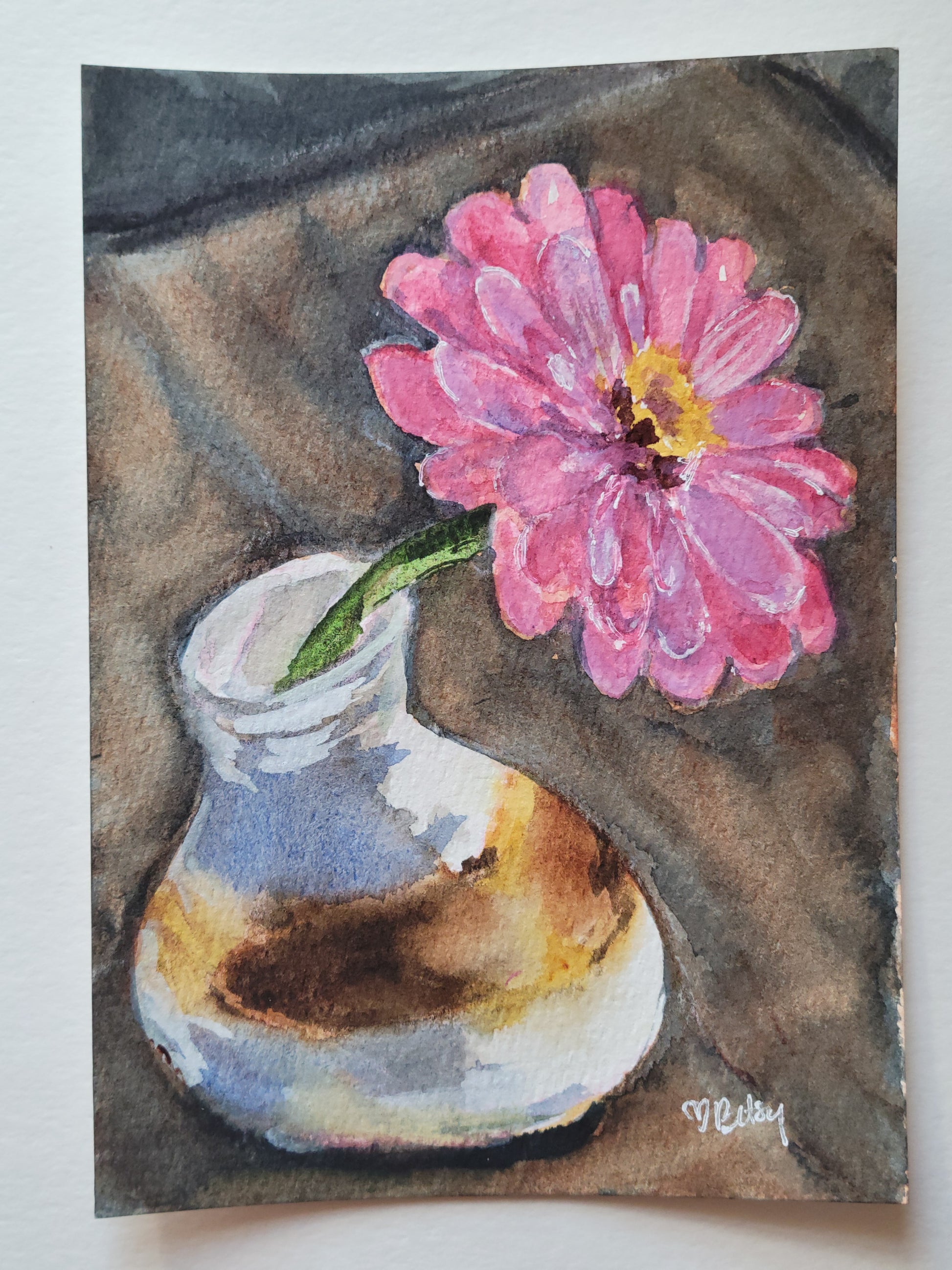 5"x7" Original watercolor painting on 140 lb. cotton watercolor paper by Betsy Gaccione. I planted zinnia and seeds this past spring, and it's hard to explain how much joy I've gotten every day this summer by what has grown - from observing the miracle of the colors and blooms themselves, to cutting and gifting them to others, to the inspiration to paint them. I got such a dopamine hit from seeing just this one single bloom on display on my desk, lit up by the sun like it was electrified, that I had to try and capture it in a painting. Art piece will come matted to fit a standard 8x10 photo frame.